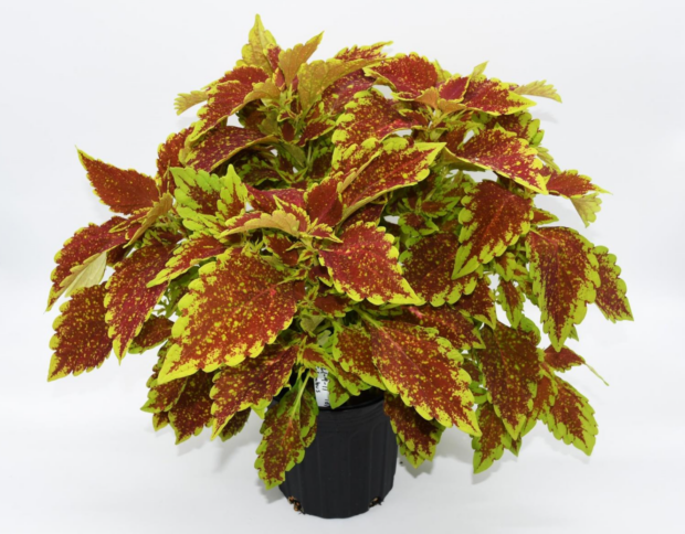 Description: ‘UF21-9-11’ has ruffled, highly lobed foliage that is predominantly garnet red with consistent lemon yellow accents and leaf margins. Maintains colors in both shade and sun. ‘UF21-9-11’ is upright in habit, but it is highly branched and spreading in form, growing wider than it does tall. This allows the plant to have good potential for use in the garden landscape as a specimen or in mass plantings.