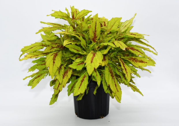Description: ‘UF21-9-4’ has lance-shaped foliage that is predominantly chartreuse with consistent magenta centers and lemon yellow spots. Maintains colors in both sun and shade. It is upright in habit, but it is highly branched and spreading in form, growing wider than it does tall. This allows the plant to have good potential for use in the garden landscape as a specimen or in mass plantings.